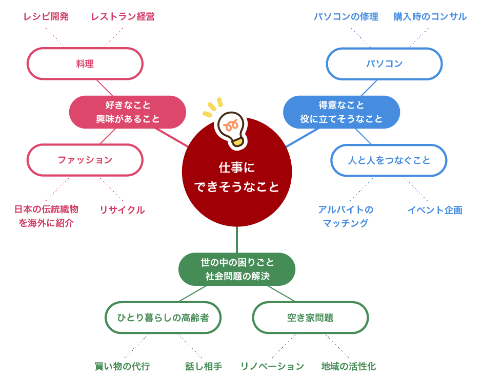 「好きなこと・興味があること」「得意なこと・役に立てそうなこと」「世の中の困りごと・社会問題の解決」の3つの観点から考えるとアイディアが広がりやすくなります。